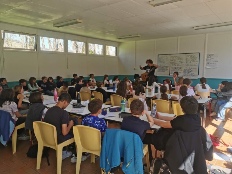 C’est le lundi 31 mars, nous sommes les 6A, les 6D et les CM2. Nous partons pour trois jours en résidence artistique à Libarrenx, travailler avec Maialen Errotabehere, David Cairol et Bolzed. Il fallait créer une chanson en Basque et en Français sur le thème de l’année « La paix si c’était possible ». Chacun a donné ses idées : faire la paix avec soi-même, trouver la paix avec les copains et la famille, se réconcilier entre pays…J’ai trouvé que nous avions passé un moment magique avec tous nos copains et copines lors de ces différentes créations.