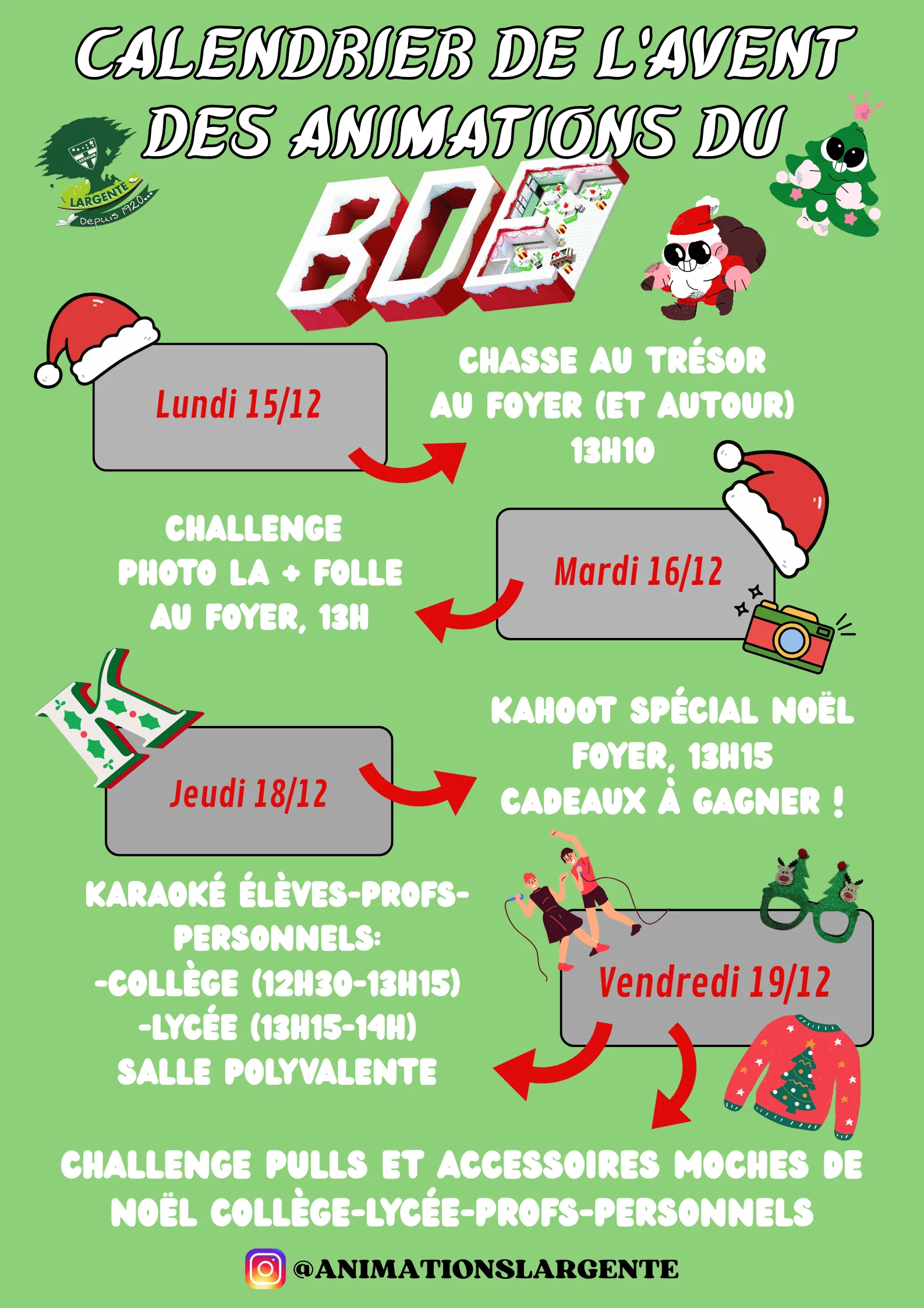 Tout au long de la semaine, élèves, profs et personnels sont invités à participer à une série d’activités festives : chasse au trésor, challenge photo, Kahoot spécial Noël, karaoke et journée des pulls moches.